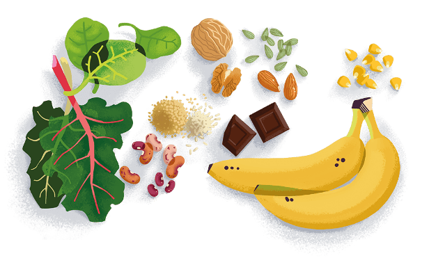Printre cele mai bogate alimente în magneziu, regăsim: nucile, cacao, semințele oleaginoase (de exemplu semințele de dovleac, floarea-soarelui, in și soia), fasolea, cerealele și toate legumele verzi (magneziul fiind parte integrantă a clorofilei!). Alte alimente care pot aduce un aport important de magneziu sunt fructele (banane, caise, piersici), carnea, peștele și produsele lactate. Prepararea termică a alimentelor, chiar și pentru o perioadă scurtă de timp, poate reduce semnificativ conținutul de magneziu, dar și al altor nutrienți importanți.7,8,18,19,50
